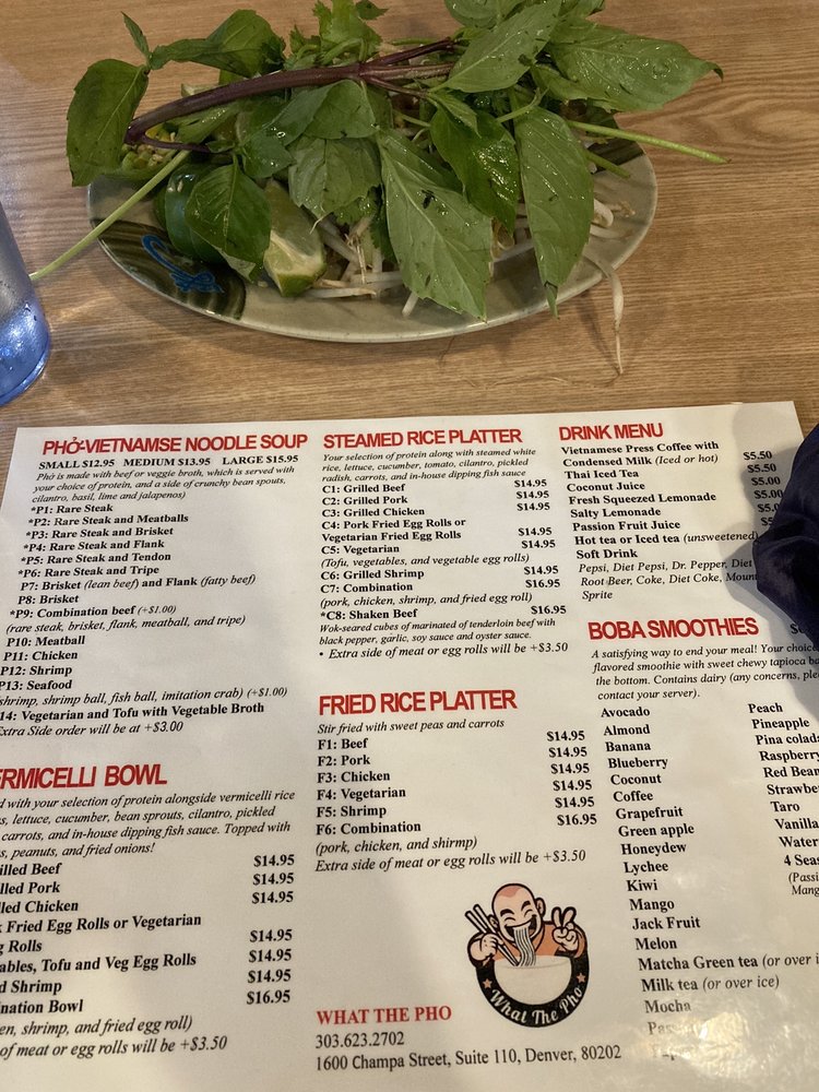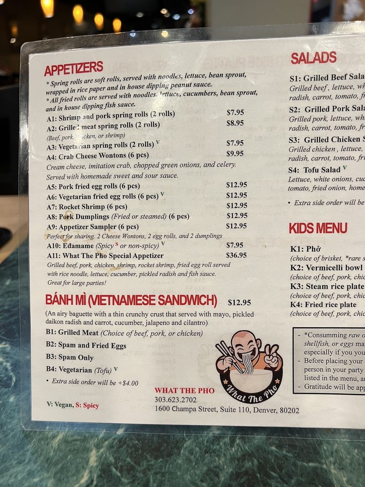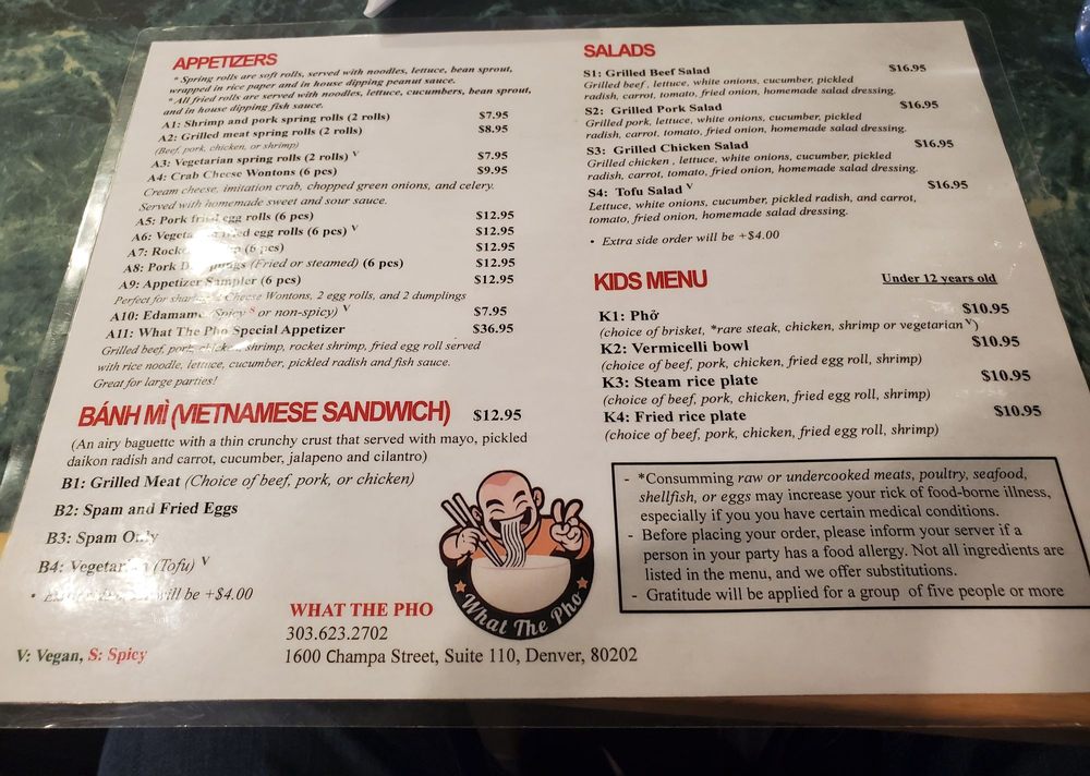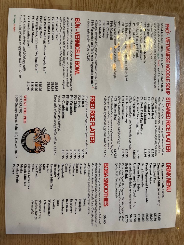 Introducing What the Pho, a hidden gem in downtown Denver offering a variety of Vietnamese dishes. The restaurant is casual and cozy, perfect for a quick dinner or group gathering. What the Pho takes reservations, offers delivery and takeout, and caters to vegans and vegetarians with many options. Their menu features delectable appetizers like shrimp and pork spring rolls, along with flavorful pho bowls like rare steak and meatballs. The grilled vermicelli bowls are also a must-try, with options like grilled beef and pork. Customers rave about the quality and taste of the dishes, with one reviewer praising it as the best pho they've ever had. Don't miss out on the authentic flavors and friendly service at What the Pho.